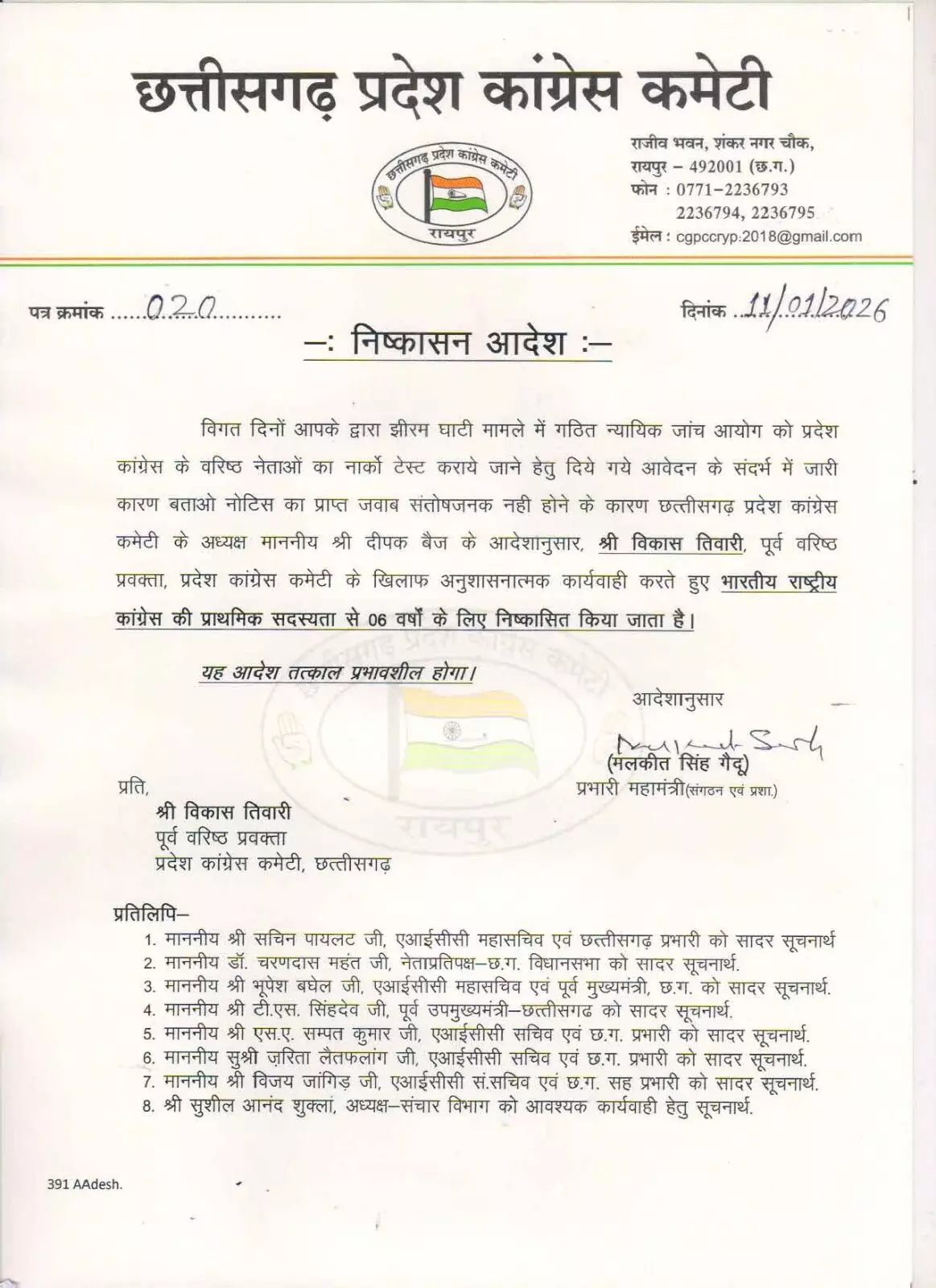 ”विगत दिनों आपके द्वारा झीरम घाटी मामले में गठित न्यायिक जांच आयोग को प्रदेश कांग्रेस के वरिष्ठ नेताओं का नार्को टेस्ट कराये जाने हेतु दिये गये आवेदन के संदर्भ में जारी कारण बताओ नोटिस का प्राप्त जवाब संतोषजनक नही होने के कारण छत्तीसगढ़ प्रदेश कांग्रेस कमेटी के अध्यक्ष दीपक बैज के आदेशानुसार, विकास तिवारी, पूर्व वरिष्ठ प्रवक्ता, प्रदेश कांग्रेस कमेटी के खिलाफ अनुशासनात्मक कार्रवाई करते हुए भारतीय राष्ट्रीय कांग्रेस की प्राथमिक सदस्यता से 6 वर्षों के लिए निष्कासित किया जाता है।”