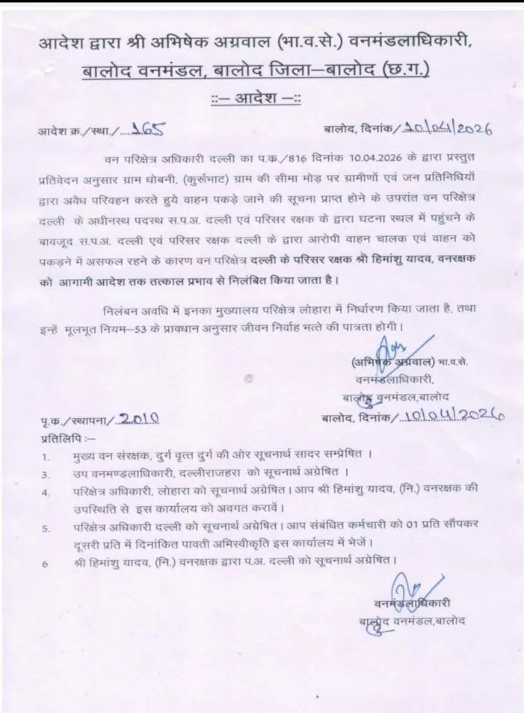 पूरा मामला दल्लीराजहरा वन क्षेत्र के धोबनी गांव का है, जहां लकड़ी के अवैध परिवहन को लेकर ग्रामीणों और जनप्रतिनिधियों ने वन विभाग की कार्यशैली पर सवाल खड़े किए। जिसके बाद DFO ने मामले को गंभीरता से लेते हुए, वन रक्षक हिमांशु यादव को निलंबित कर दिया।