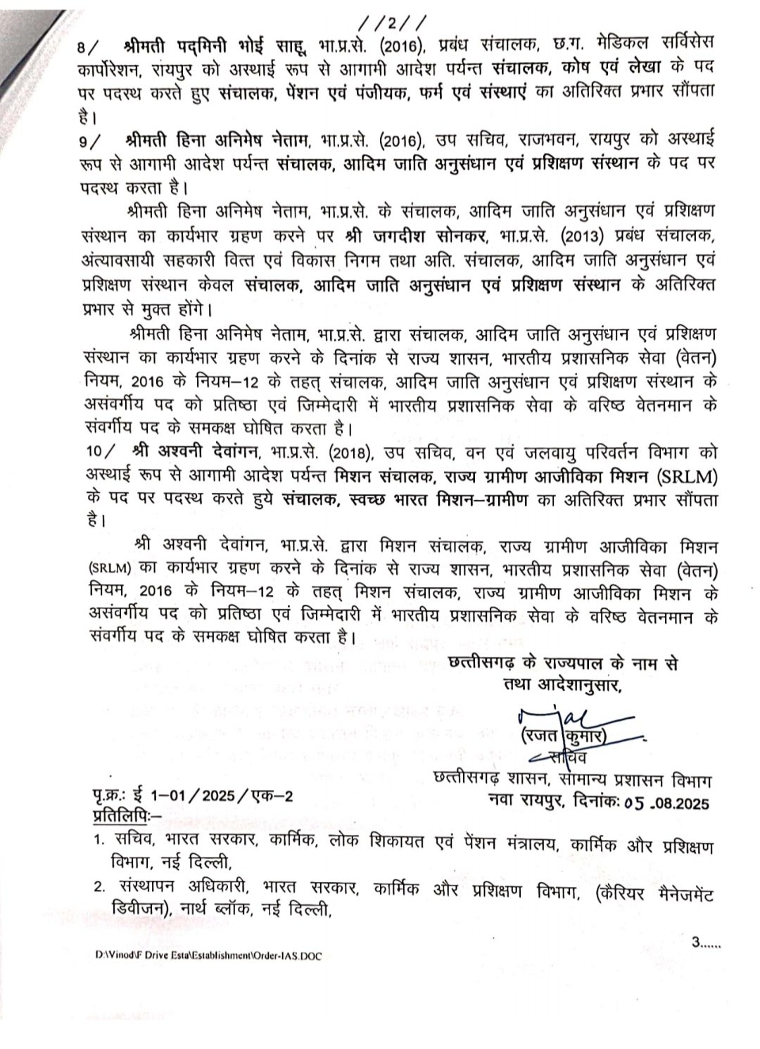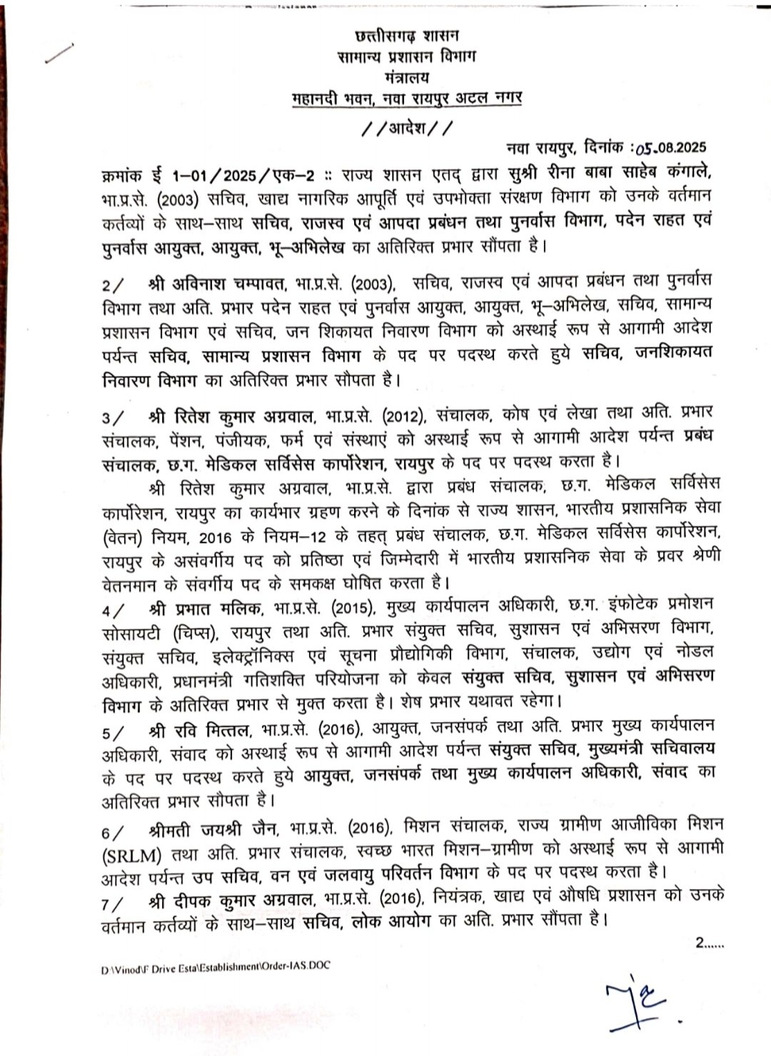 प्रभात मलिक, भा.प्र.से. (2015), मुख्य कार्यपालन अधिकारी, छ.ग. इंफोटेक प्रमोशनसोसायटी (चिप्स), रायपुर तथा अति प्रभार संयुक्त सचिव, सुशासन एवं अभिसरण विभाग,संयुक्त सचिव, इलेक्ट्रॉनिक्स एवं सूचना प्रौद्योगिकी विभाग, संचालक, उद्योग एवं नोडलअधिकारी, प्रधानमंत्री गतिशक्ति परियोजना को केवल संयुक्त सचिव, सुशासन एवं अभिसरण विभाग के अतिरिक्त प्रभार से मुक्त करता है। शेष प्रभार यथावत रहेगा।