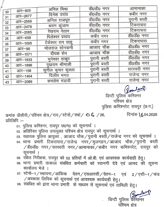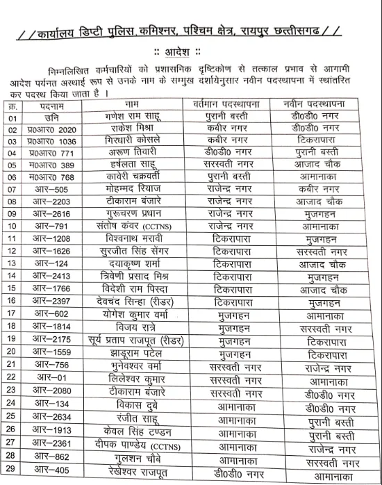 Police Transfer/रायपुर : पुलिस महकमे में बड़ा फेरबदल हुआ है। रायपुर पश्चिम क्षेत्र के पुलिस उपायुक्त संदीप पटेल ने 43 पुलिस कर्मियों का तबादला किया है। जिसका आदेश भी जारी कर दिया गया है।